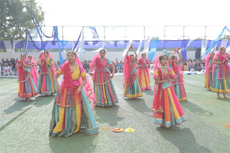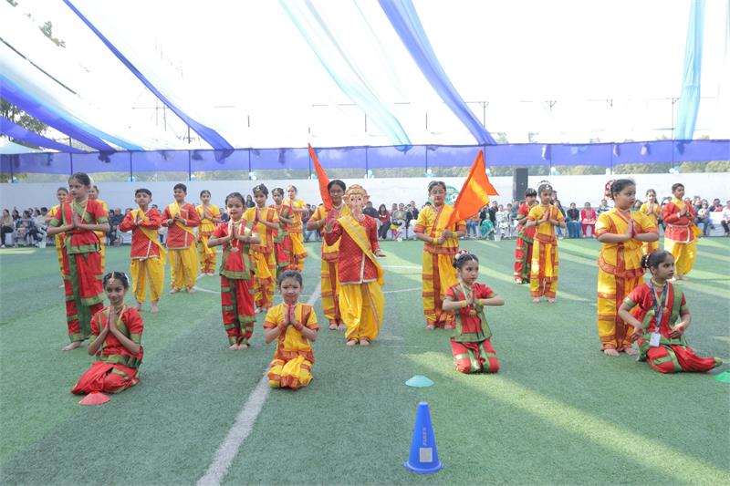 The spectacular event commenced with the auspicious lighting of the ceremonial lamp followed by scintillating invocation of Saraswati Vandana performed by the students. The Vice Principal of the School, Ms. Rajesh Banopreeya, addressed the august gathering outlining the theme of the event and also congratulated the students and parents for their exemplary performance and efforts put up to make it a memorable day for everyone. This was accompanied by the cultural programme which was a skit on ‘Vasudhaiv Kutumbakam – The Religion of Love and Attachment’. The grand finale showcased the power of global unity and love even in the gravest of times. The audience was visibly impressed by the impeccable performance showcased by the students. The parents appreciated the theme chosen and its indelible imprint on the students. The students were seen performing with full enthusiasm, gusto and zeal.