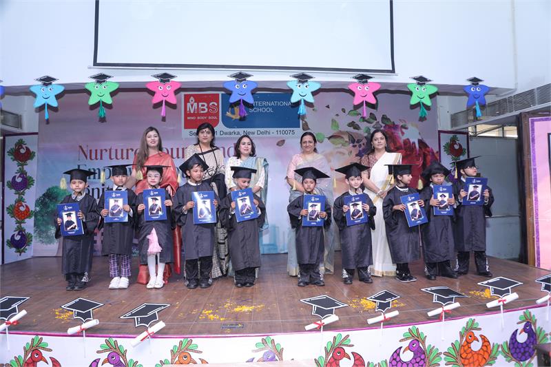 “Graduation is an exciting time. It is both an ending and a beginning. It is warm memories of the past and big dreams for the future." MBS International School, Dwarka celebrated Graduation Day to applaud the young enthusiastic learners of class Pre-Primary for their commendable performance in the session 2019-20. The occasion was graced by Mr. Satish Kumar, DCP, Dwarka. The ceremony was also attended by the parents of the students of class Pre-Primary. The celebration commenced with the welcome of the Chief Guest by the school Principal Mr. Atul Wadhawan. This was followed by lamp lighting ceremony and Ganesh Vandana to evoke the blessings of Lord Ganesha. The gathering was then addressed by the Vice Principal highlighting the vision of the school and role of parents and teachers in the students’ learning process. The most important part of the day- Graduation Ceremony began with the tiny tots of Pre Primary dressed in Graduation robes and caps walking the stage. Each child walked the ramp and spoke about a social message with amazing confidence and poise which itself speaks heights about the comprehensive learning that takes place in MBS International School. The Principal and the Chief Guest felicitated the students with trophies and certificates of graduation. The Pre-Primary students left everybody spell bound with their mesmerizing dance performance. Vibrant music, dance, breathtaking colours and beautifully synchronized movements promptly set the tone and mood of the atmosphere. Their energetic booming and clapping coaxed the audience to sway to its lively beats. The programme culminated with the vote of thanks by the Pre-Primary Coordinator Ms. Jyotika. It was indeed a joyous and memorable day for the little ones and their parents.