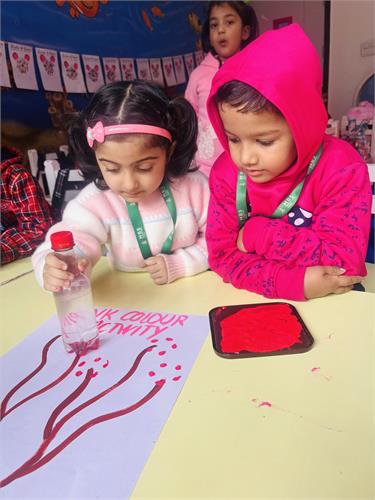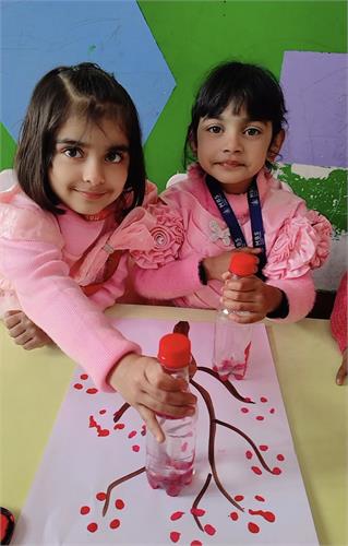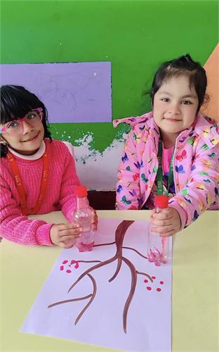 The Kindergarten students took part in an exciting bottle stamping activity. Using bottles dipped in pink paint, the children stamped different designs on sheets, creating a blossom tree pattern.