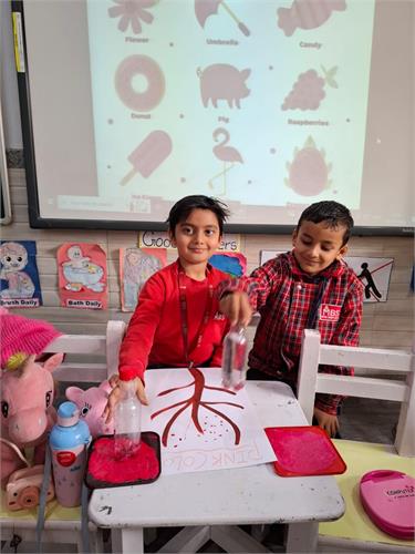 For the Nursery class, engaging art activities were planned to enhance sensory exploration and fine motor skills. The children participated in brush printing and dabbing using pink colour. They enjoyed dipping brushes in pink paint and creating lovely patterns on paper. The activity encouraged creativity, hand–eye coordination, and colour recognition.