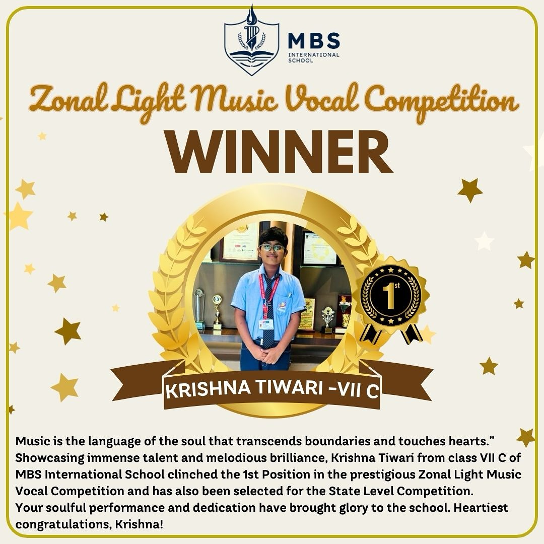 *We are immensely proud to share that Krishna Tiwari (Class VII-C) of MBS International School has secured the 1st Position in the prestigious Zonal Light Music Vocal Competition and has also qualified for the State Level Competition!