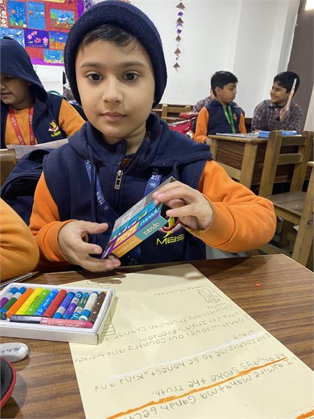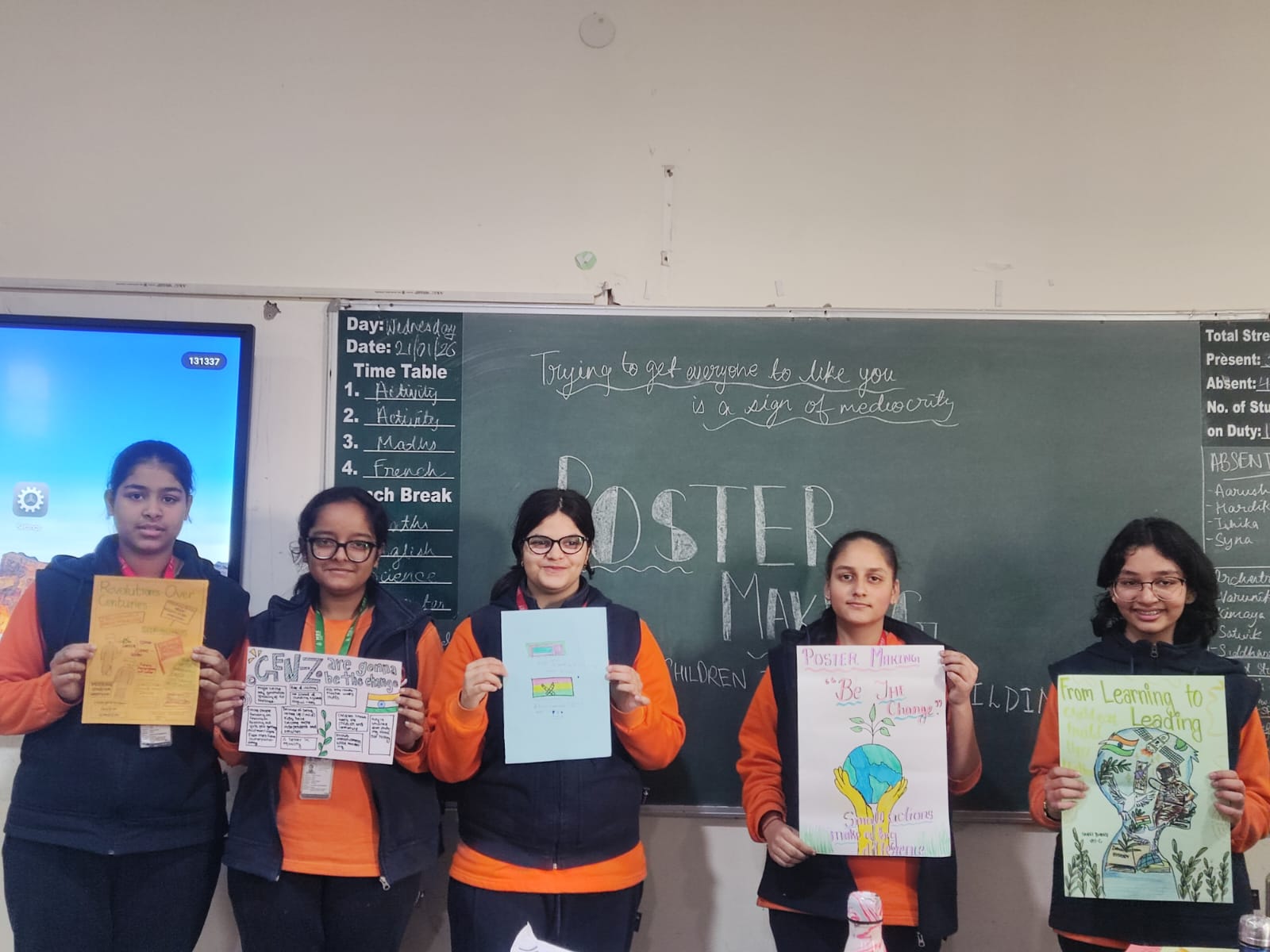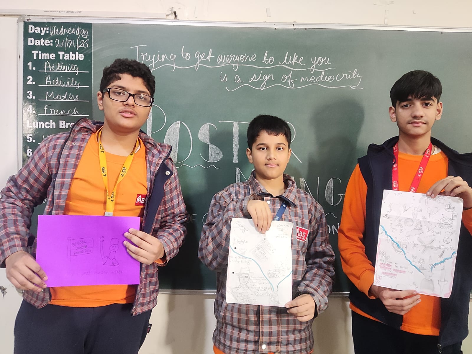 MBS International School, Dwarka, organized a Poster Making Activity for the students of Class VIII on 21st January 2026. The activity focused on highlighting the significant role of children in shaping the future of the nation through responsibility, sustainability, and innovative thinking. he teacher introduced the theme through a short and interactive discussion on nation building and the importance of young minds in bringing positive change. Sample posters and key ideas were shown to inspire students. Learners were guided to brainstorm suitable slogans, symbols, and colour combinations that reflected hope, awareness, and social responsibility. Students brought the required materials and created posters individually, showcasing their creativity, imagination, and values through drawings and meaningful messages. The teacher facilitated the activity by encouraging originality, guiding students when required, and appreciating unique ideas. The activity concluded with a brief presentation and reflection session, where students explained the message behind their posters. This helped them articulate their thoughts clearly and reflect on their role as responsible citizens. The poster-making activity proved to be an enriching experience that enhanced students’ awareness, creativity, and confidence while reinforcing important social values.