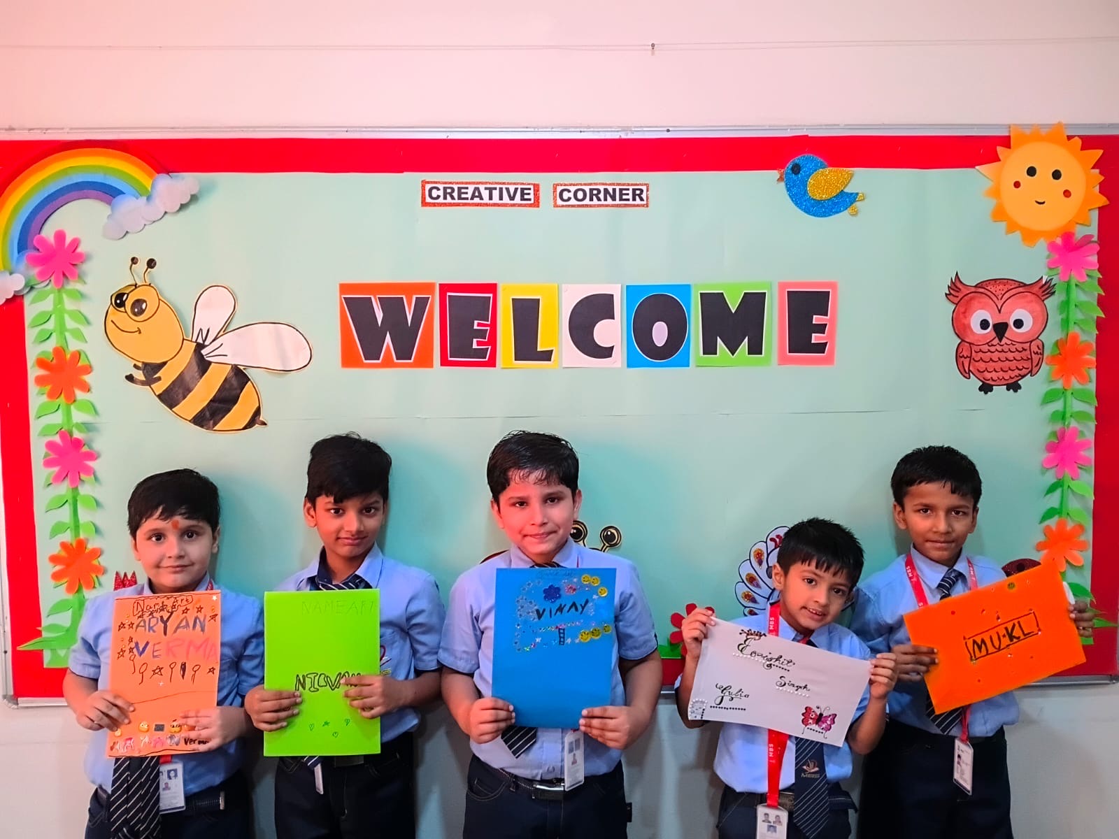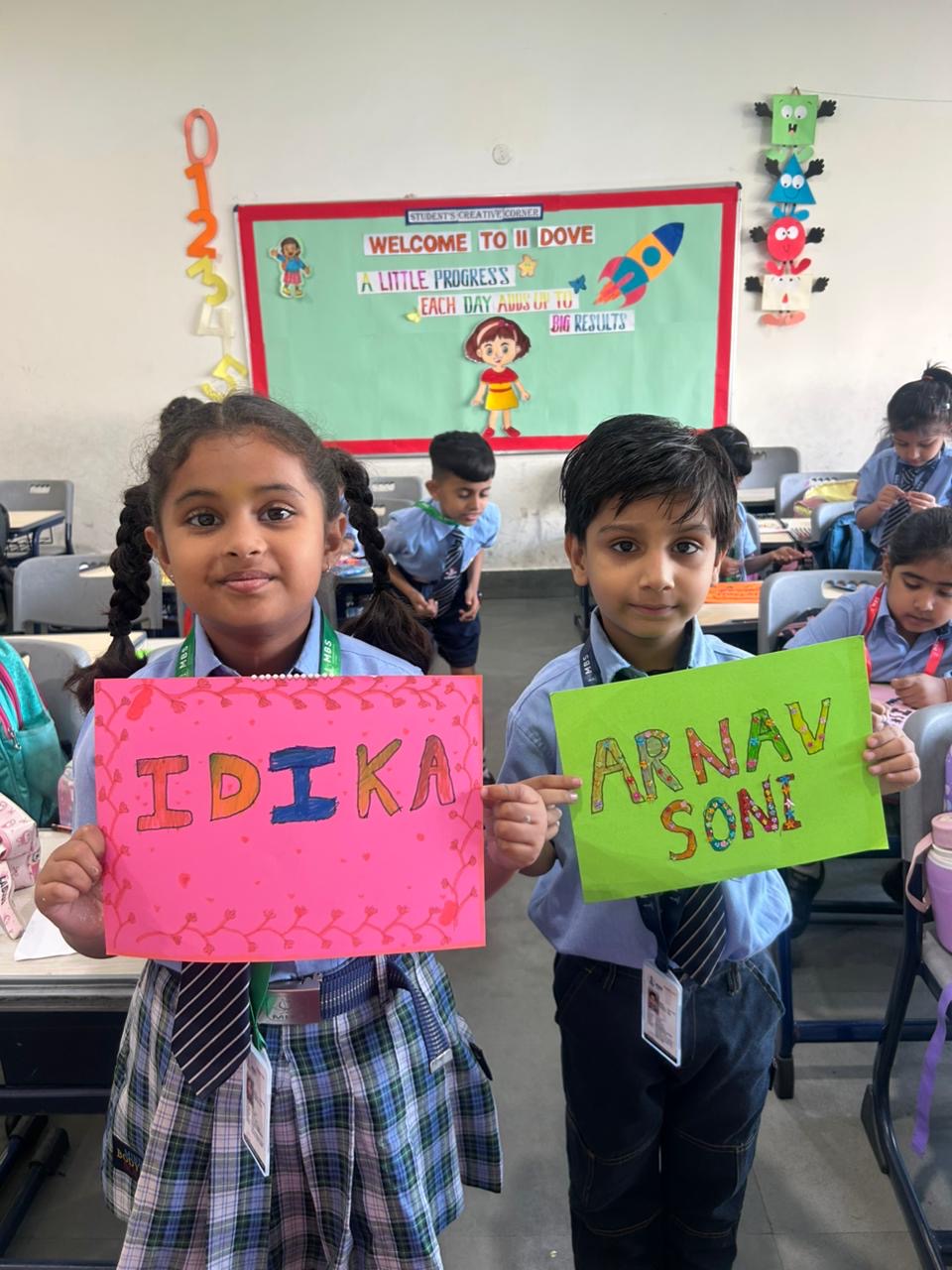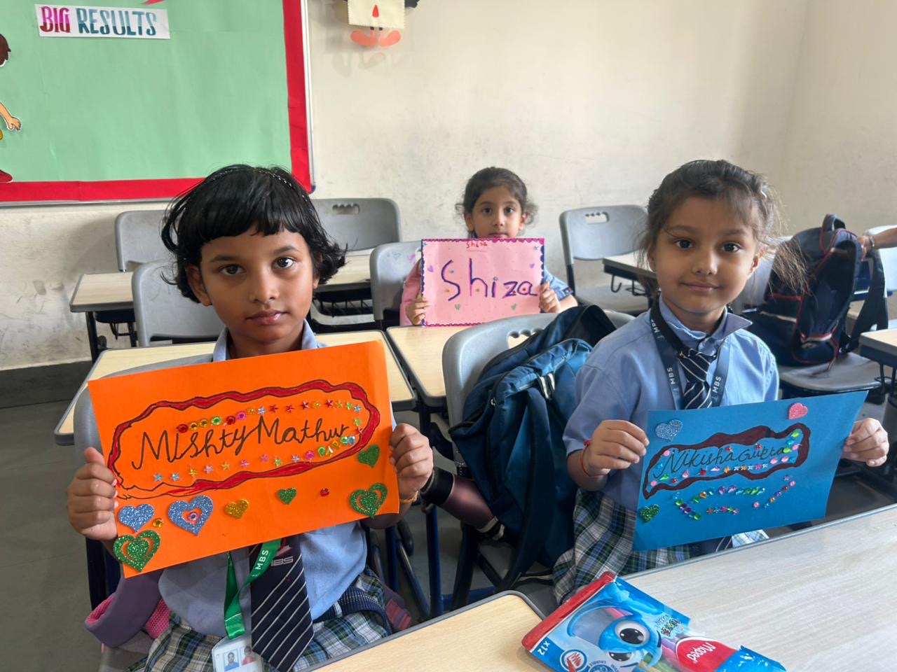 Children participated with great enthusiasm and interest. They wrote their names in bold and clear letters on A-4 sheets and decorated them beautifully using colours, stickers, and creative patterns. Each poster reflected the individuality and imagination of the students.