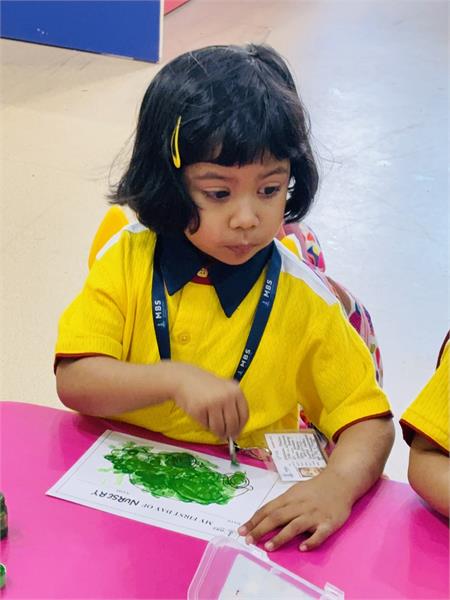 The Kindergarten students took part in an exciting bottle stamping activity. Using bottles dipped in pink paint, the children stamped different designs on sheets, creating a blossom tree pattern.