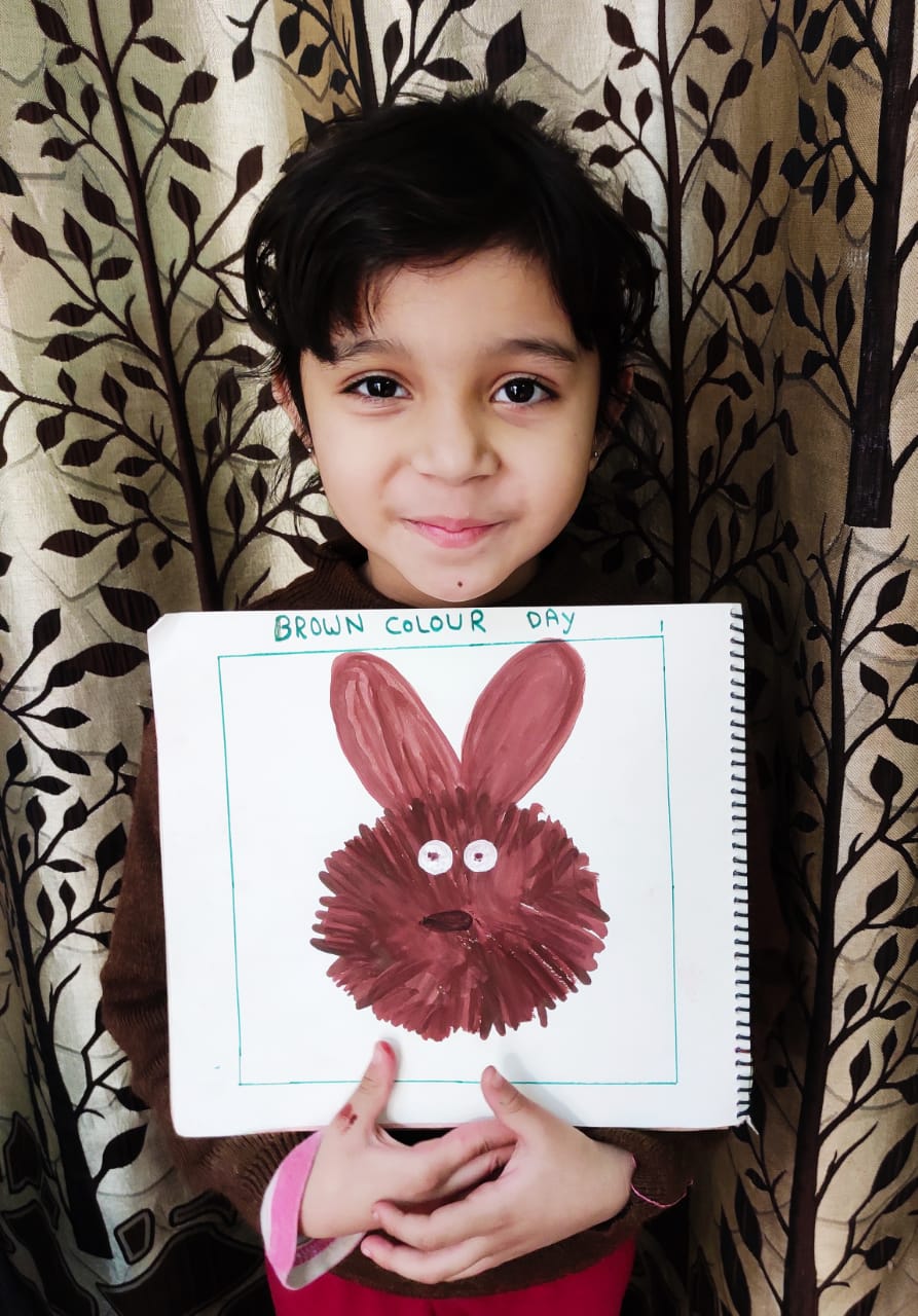 Kids of Preprimary wing were beautifully dressed up in Brown colour attire. They wisely identified the brown colour objects at their home and collected them. Children were surprised to see the magic of mixing two colours 'Blue and Red' to get a new colour 'Brown' out of it. Children enjoyed the day by doing fun activities i.e. making of Owl with sponge dabbing and making of Bear face with fork printing.