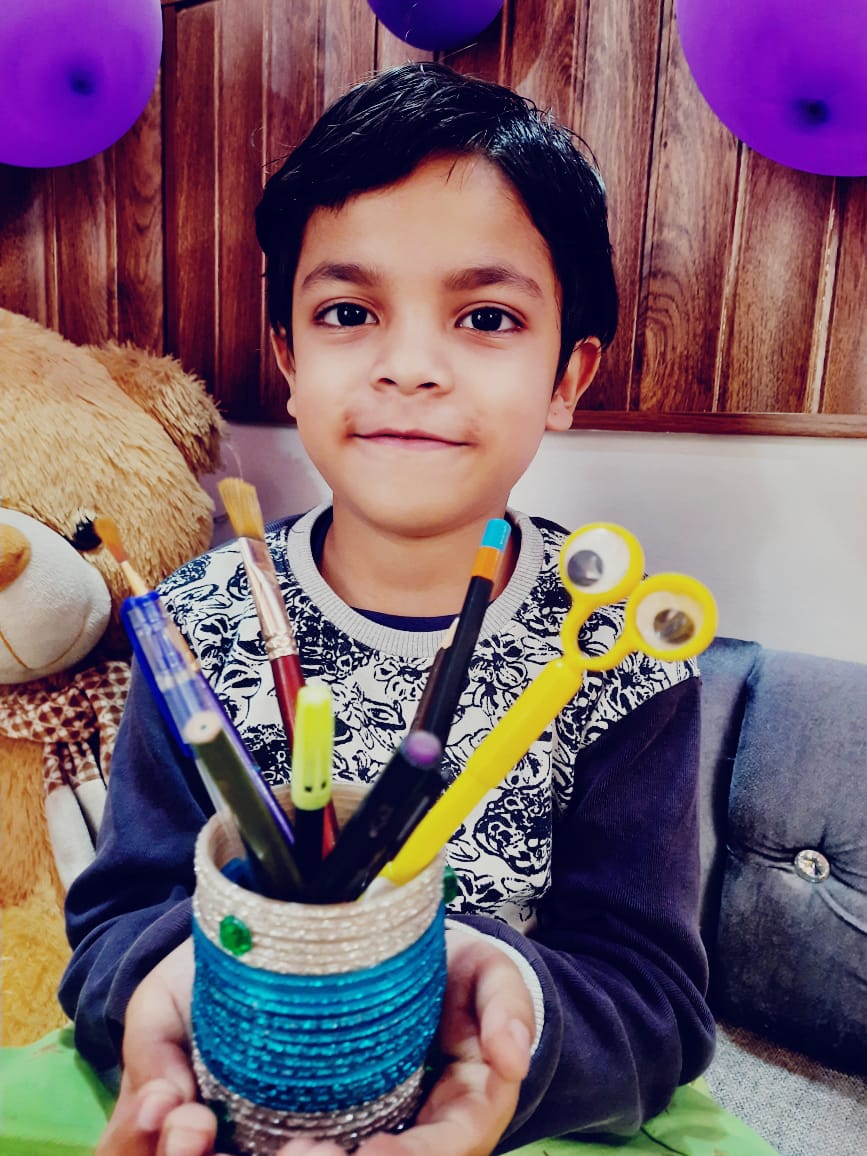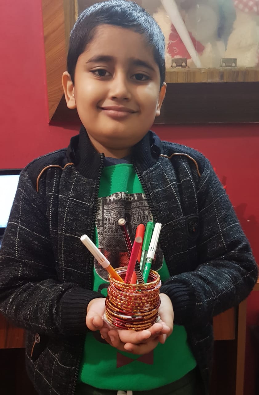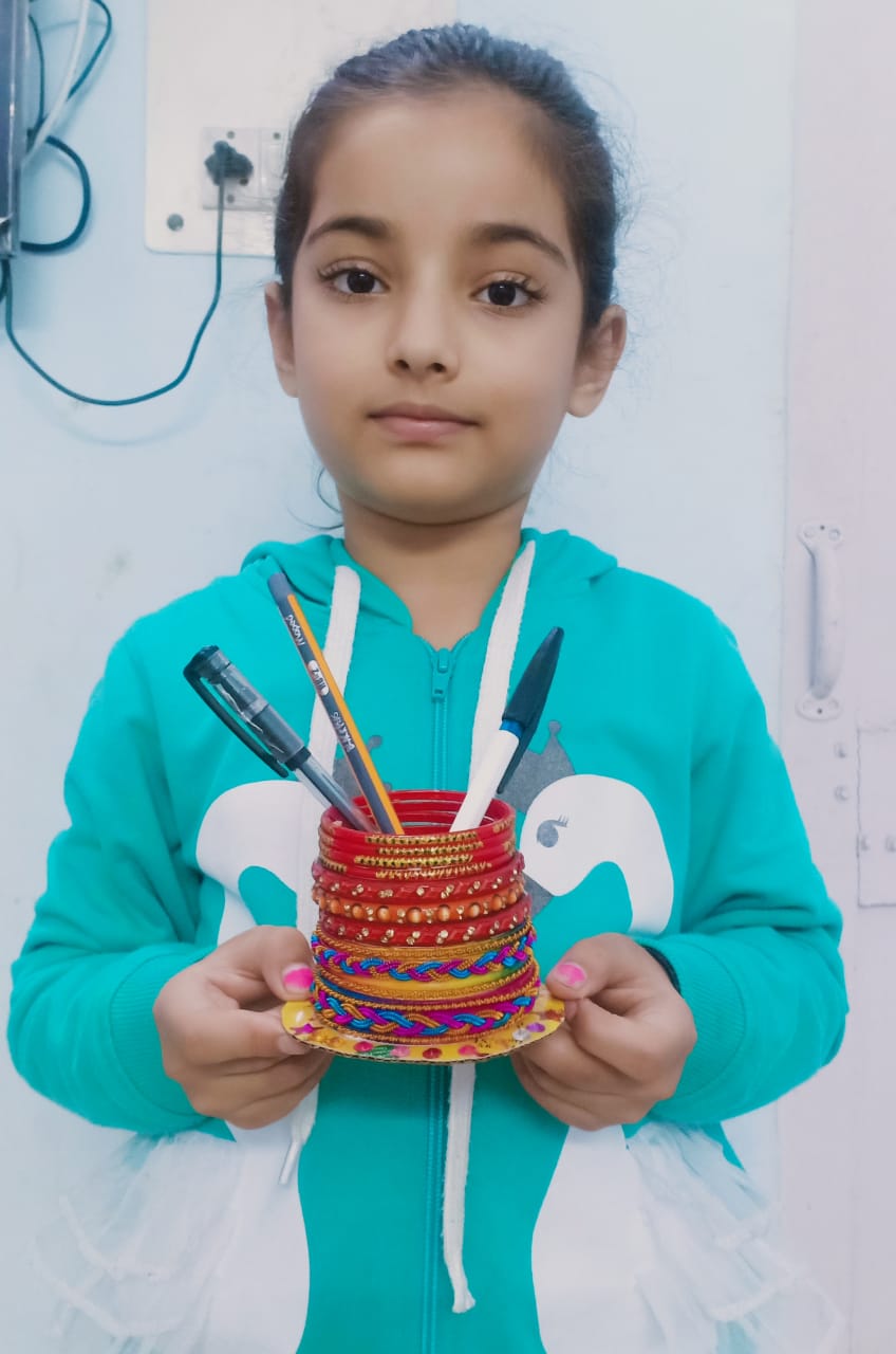 Students used their imagination and creativity to make their pen stand in an innovative way by using old bangles. This activity was aimed to motivate our kids to reduce the waste to save our planet and reuse waste material in constructive manner.
