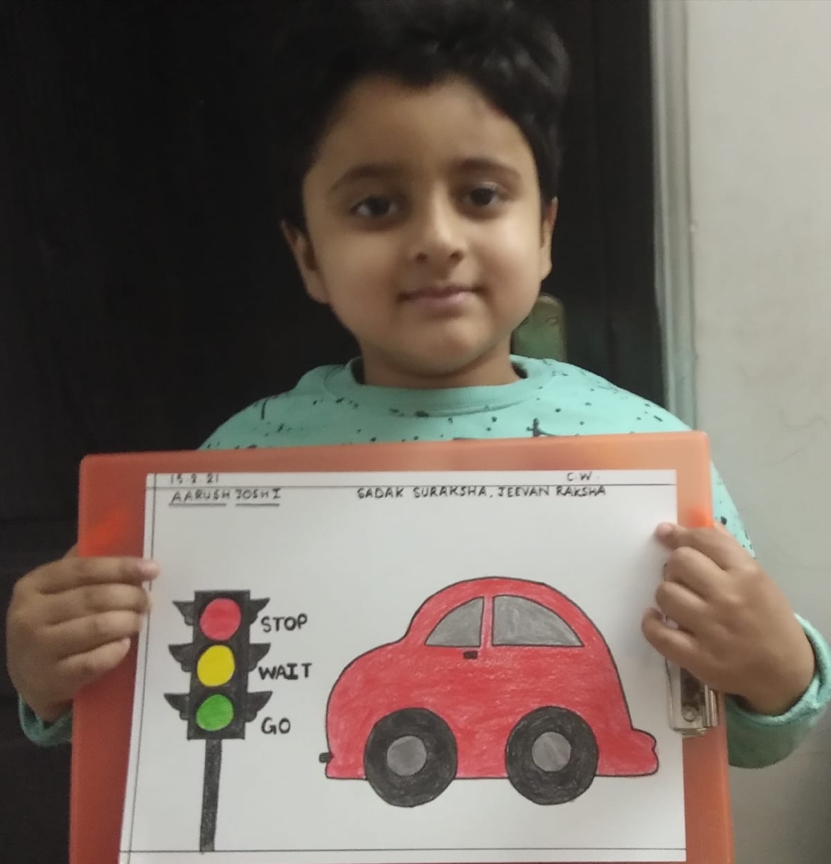 In order to create awareness among pre-primary children MBS International School conducted ‘Sadak Suraksha Jeevan Raksha’ activity with great zeal and devotion. The activity was focused on making children aware about traffic rules and different important symbols related to road safety. Teachers gave valuable instructions regarding traffic rules and emphasized on wearing helmets on two wheelers vehicles and seat belts while in a car. Importance of zebra crossing, traffic signal was also emphasized upon. This was followed by a reinforcement activity where children were encouraged to colour in the traffic signal, they were also made aware about the meaning of each colour light. They also took the pledge to follow traffic rules.