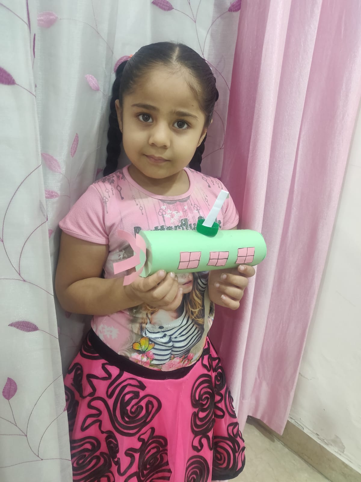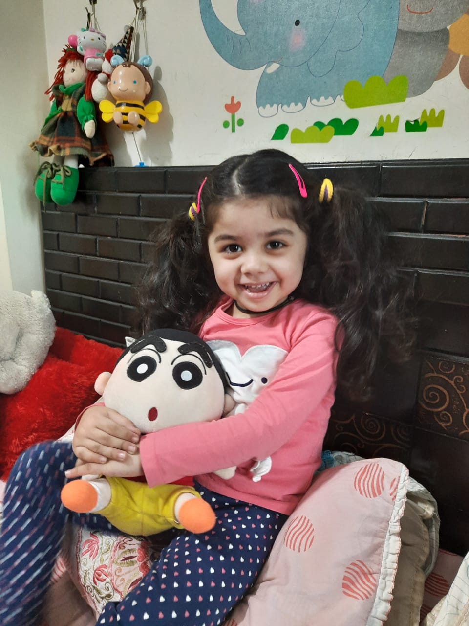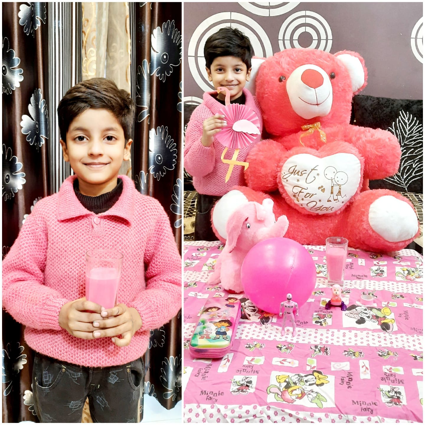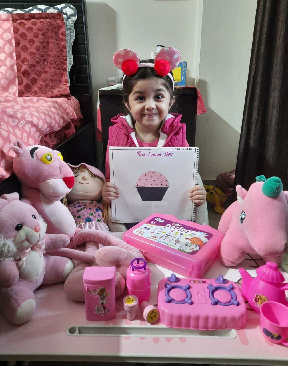 The young ones came dressed in pink colour, and brought pink-coloured toys and showed their pink-coloured toys.