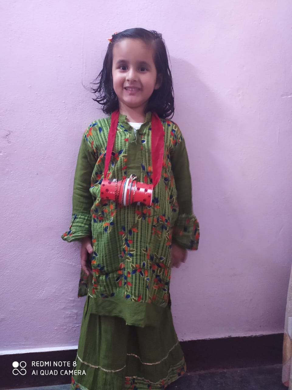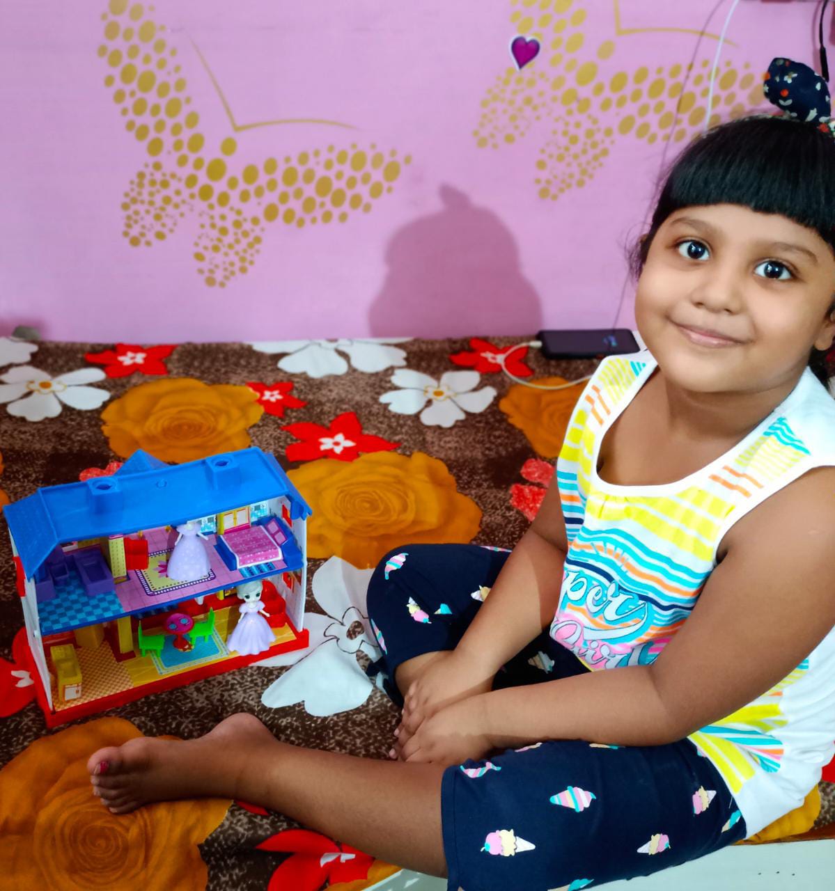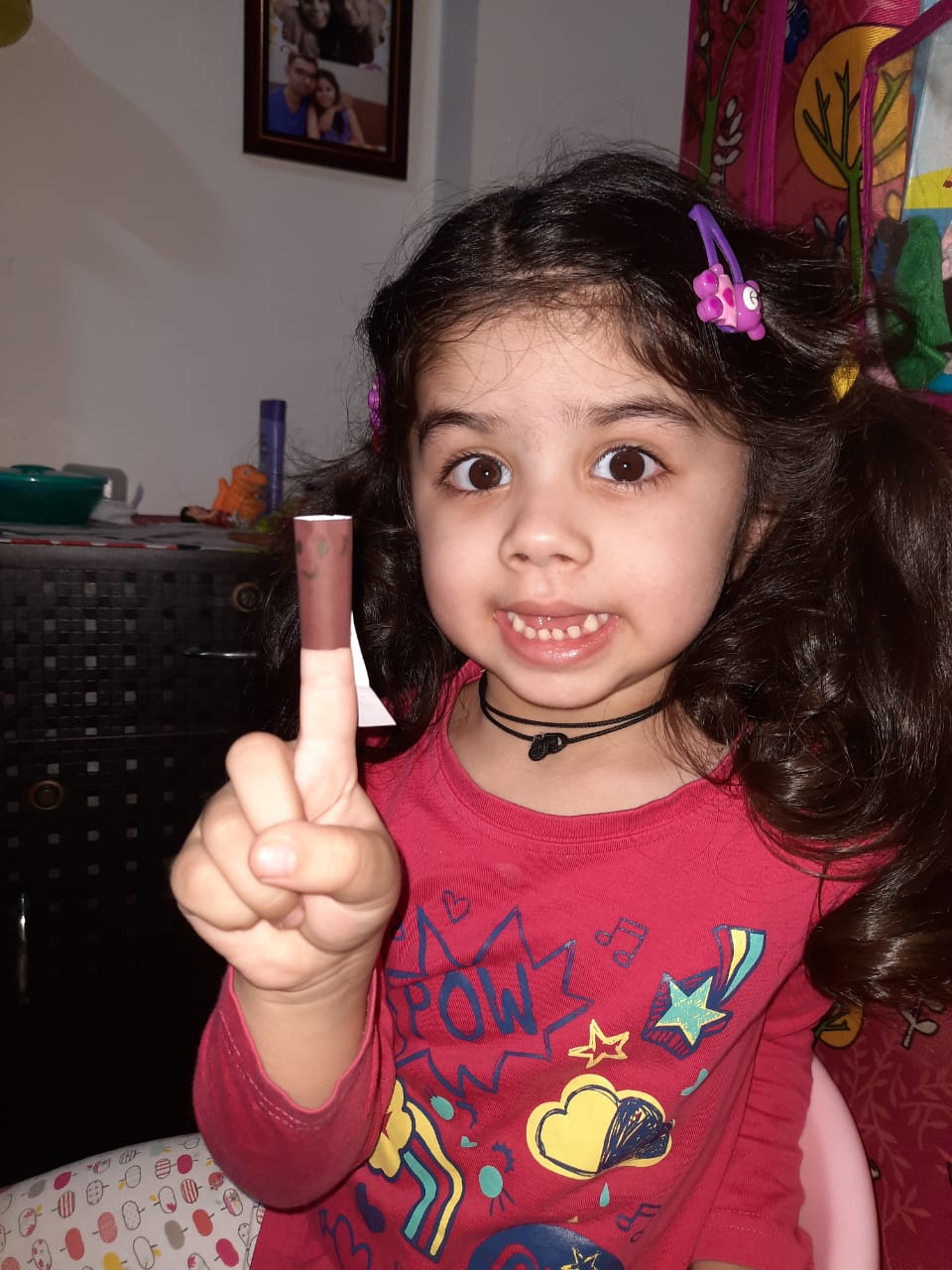 The young ones came dressed in pink colour, and brought pink-coloured toys and showed their pink-coloured toys.