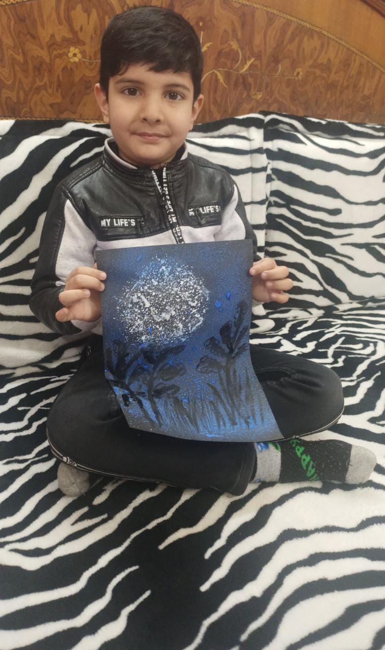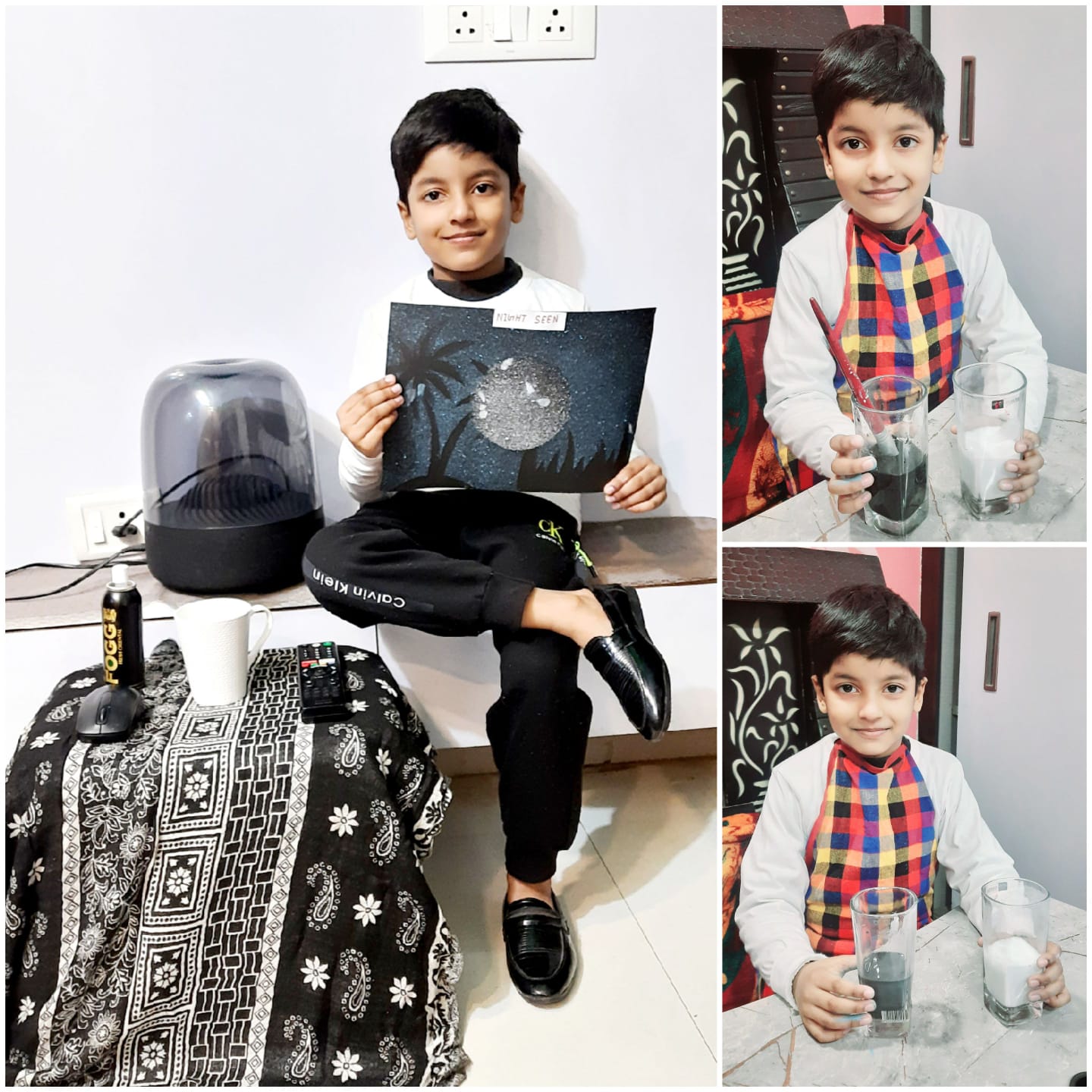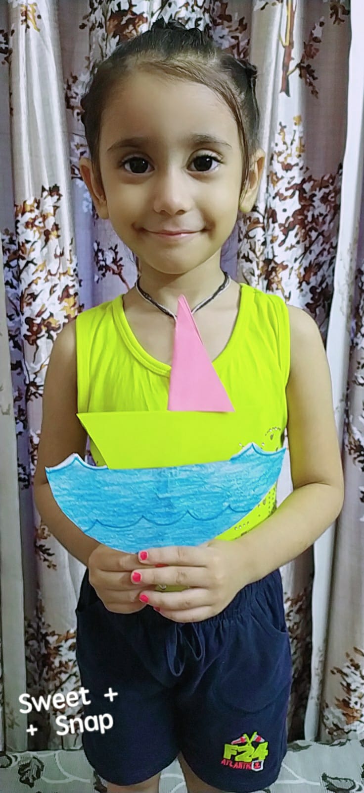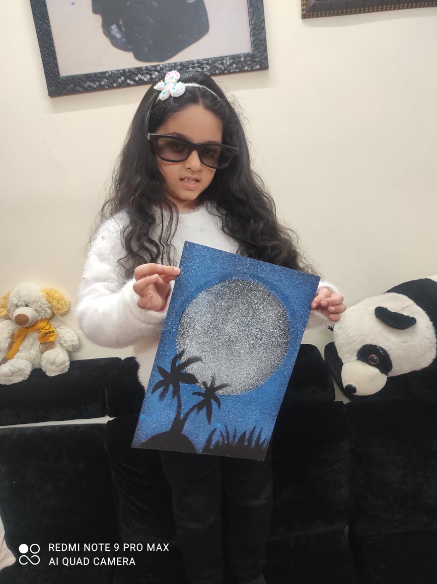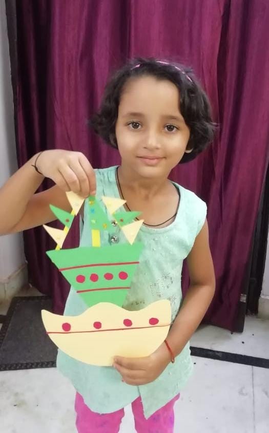 With the origami boat they created the Night Sea Scenery. They made the scene with the help of stars, cotton & white bindi.