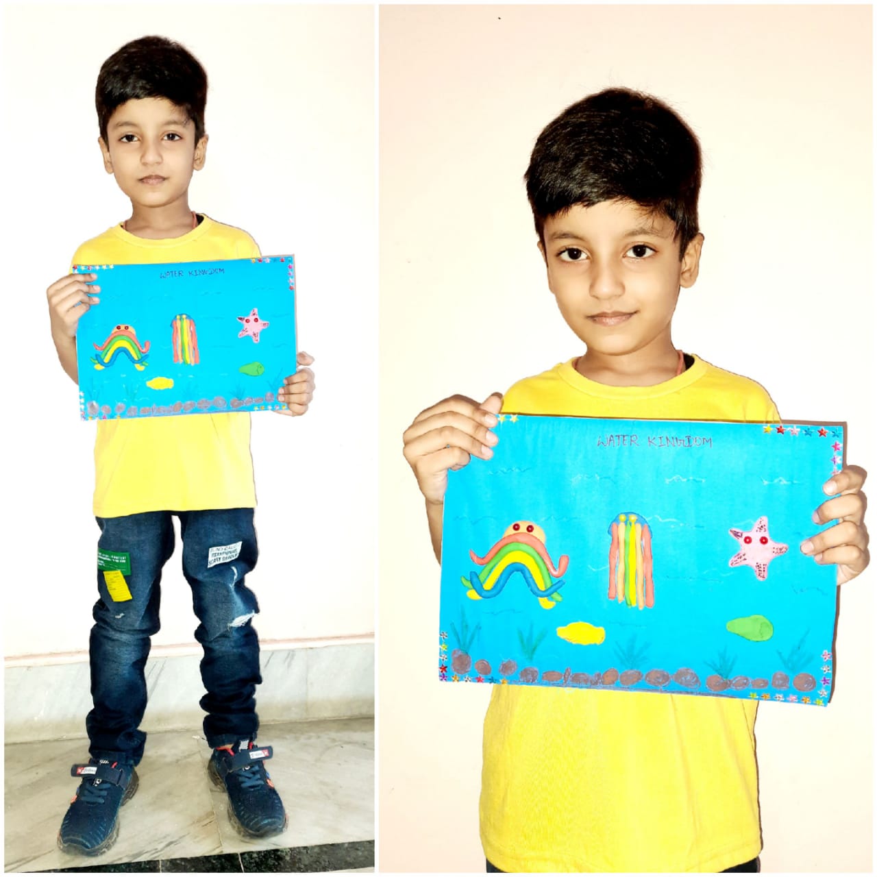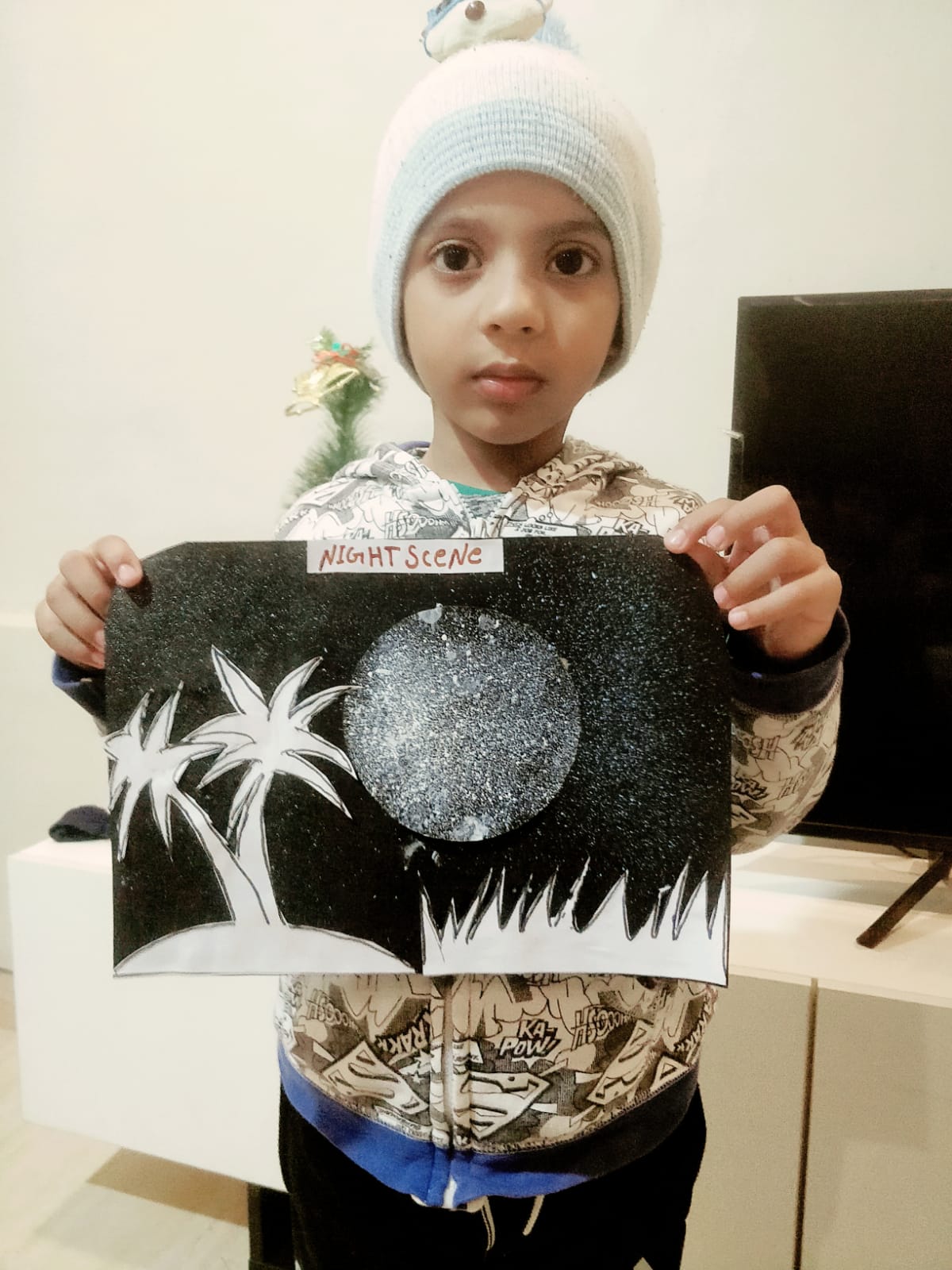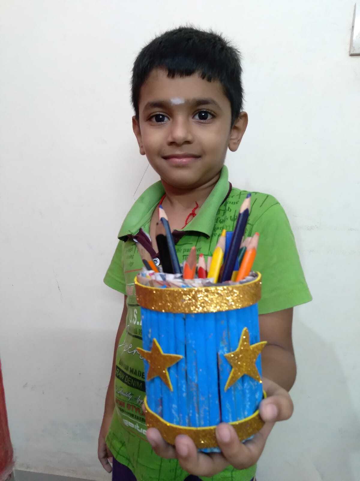 With the origami boat they created the Night Sea Scenery. They made the scene with the help of stars, cotton & white bindi.
