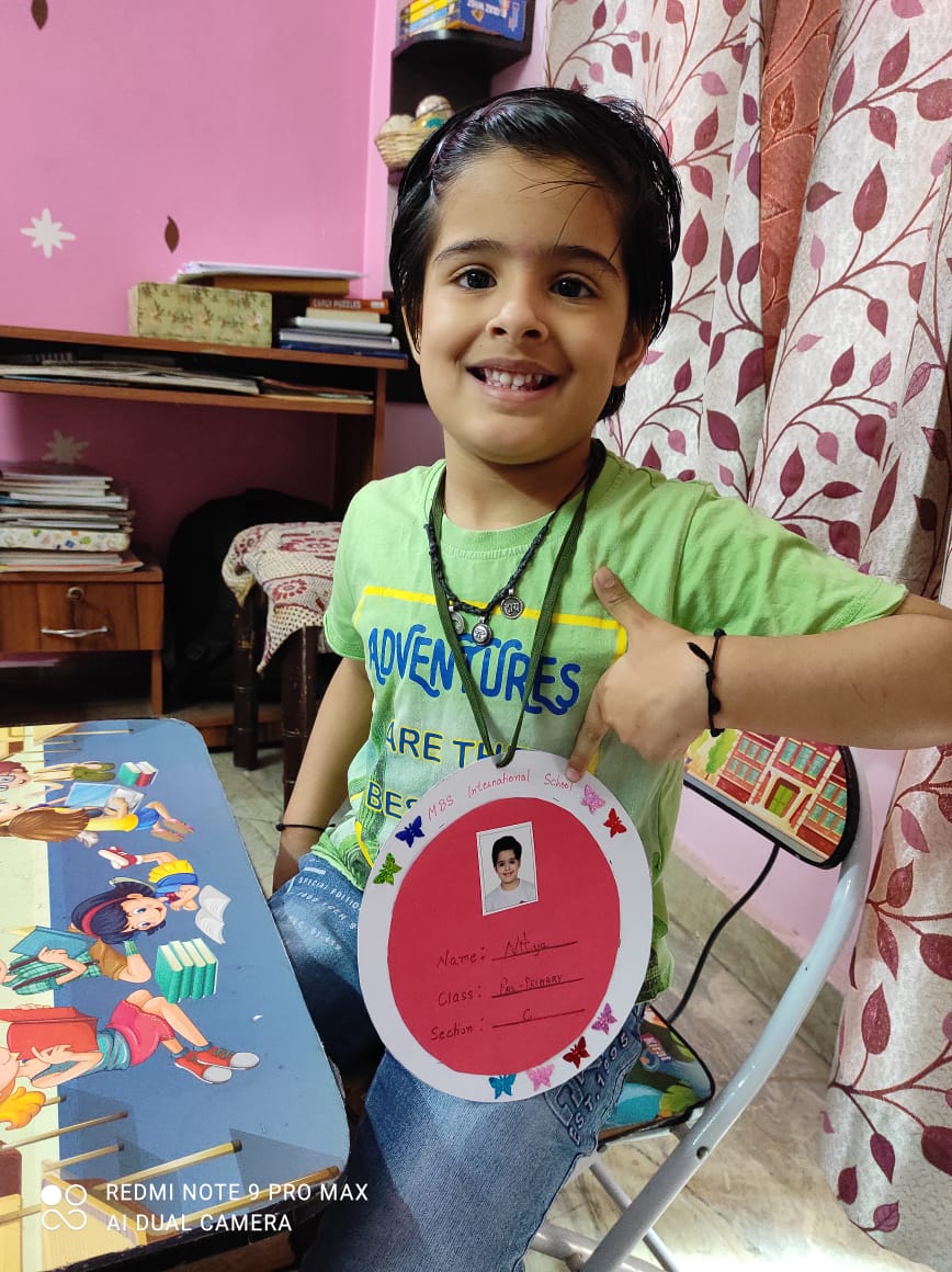 Providing opportunities where our young inquisitive minds can explore different areas of the school was made into a possibility by the activity of Knowledge Park. The pre-primary MBSians explore all about their school through a virtual tour organised by their class teachers. Children were so happy and excited to visit their school and see what all awaits them. Virtually going through the main gate, crossing the colourful corridors, visiting their classrooms, play area, IT lab etc. brought a lot of excitement in the class. They all wanted to be there. To make this whole experience more inclusive they were involved in an Identification card making activity, which they wore during their online class with a big smile on their faces.