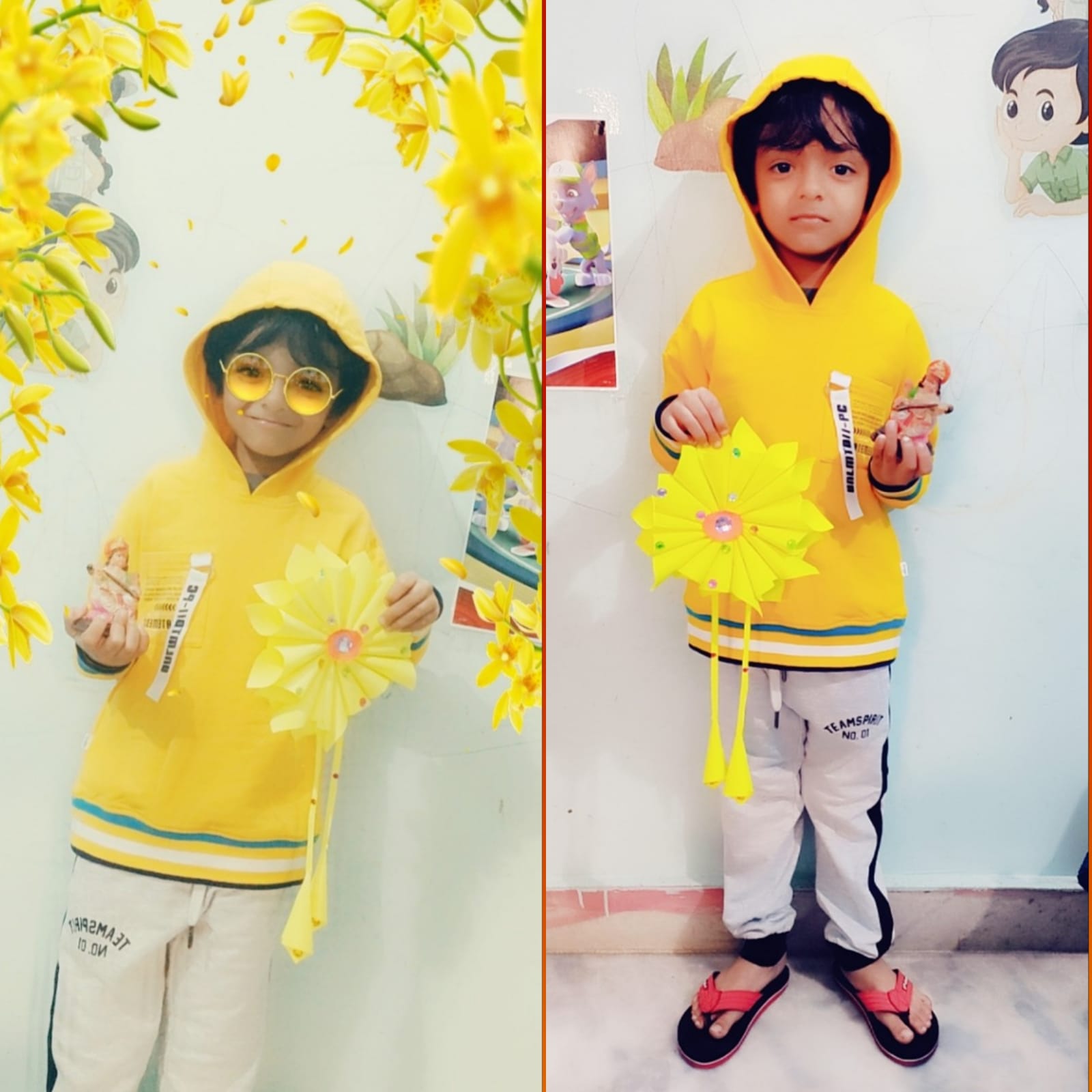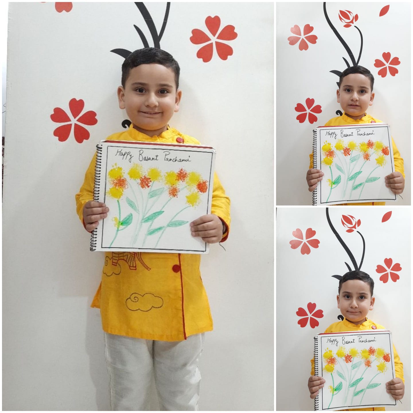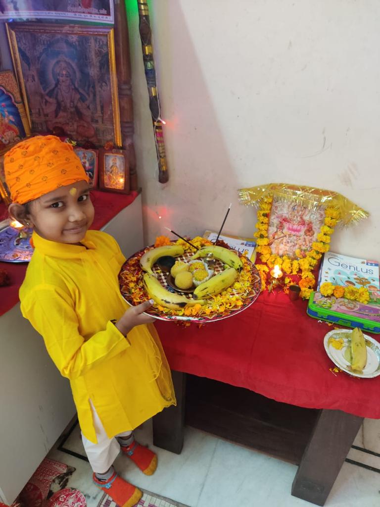 The children of the preschool & pre-primary classes were dressed in yellow clothes. Preschoolers made yellow flower impression in their sketch files and Pre-primary students made Sunflower wall hanging. Children assembled together to pray and attain blessings from Goddess Saraswati to reach the epitome of knowledge. The pooja started with a beautiful Saraswati Vandana. The children enjoyed the day, enlightened with the blessings of Goddess Saraswati.
