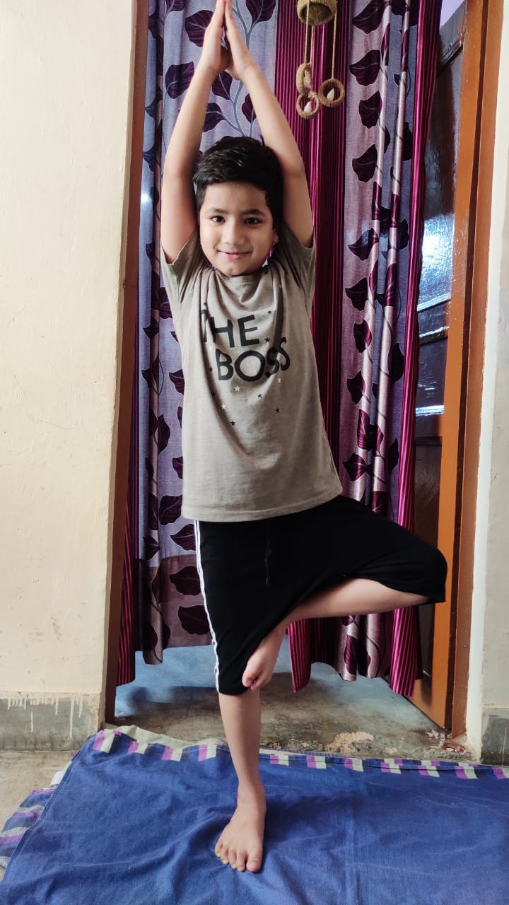 The session began by seeking the blessings of the Almighty by chanting the Gayatri Mantra. Asanas starting with warming up and stretching were followed by a series of Vrikshasana, Tadasana, Padahastasana, ArdhaChakrasana, Trikonasana, Bhujangasana etc. and ending with Shavasana. The benefits of the postures were narrated by the Yoga teacher side by side as children performed with the instructions e.g., the importance of meditation and pranayama, in day-to-day life to keeps one mentally, physically, psychologically healthy was highlighted. The session ended with a Shanti Path for peace and harmony. We all vowed to carry out the Yoga activities at our houses in future. It was a small endeavor to make the students aware to keep their body and mind fit. The session was indeed very refreshing, reviving and relaxing.